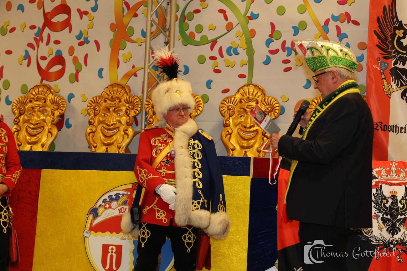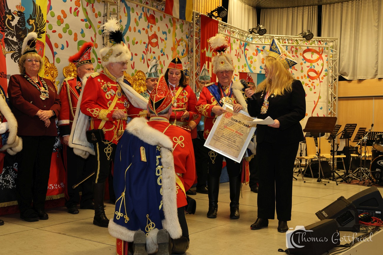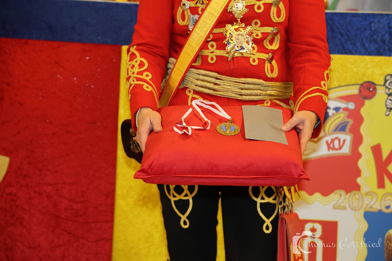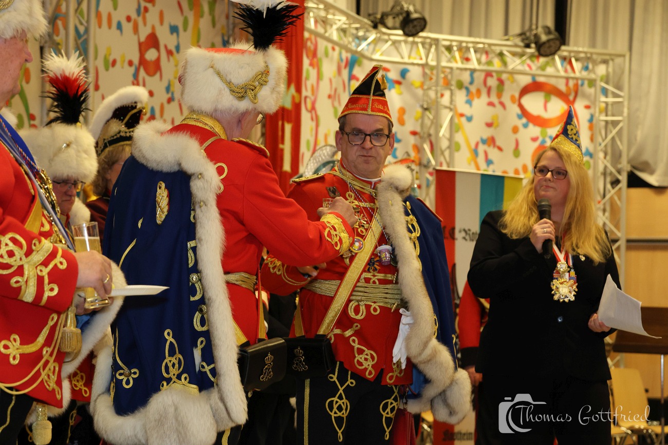 Nun folgten die Ehrungen besonders verdienter Aktiver der Roten Husaren. Der Stadtmarschall der Garde der Prinzessin Heinz Tonser verlieh im Auftrag des Mainzer Oberbürgermeisters den Stadt Orden der Aurea Moguntia an Peter Gerhard.