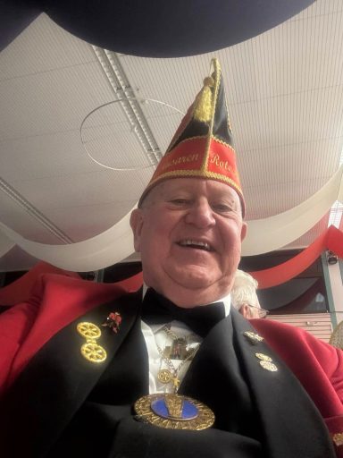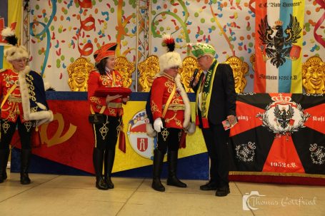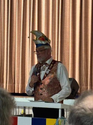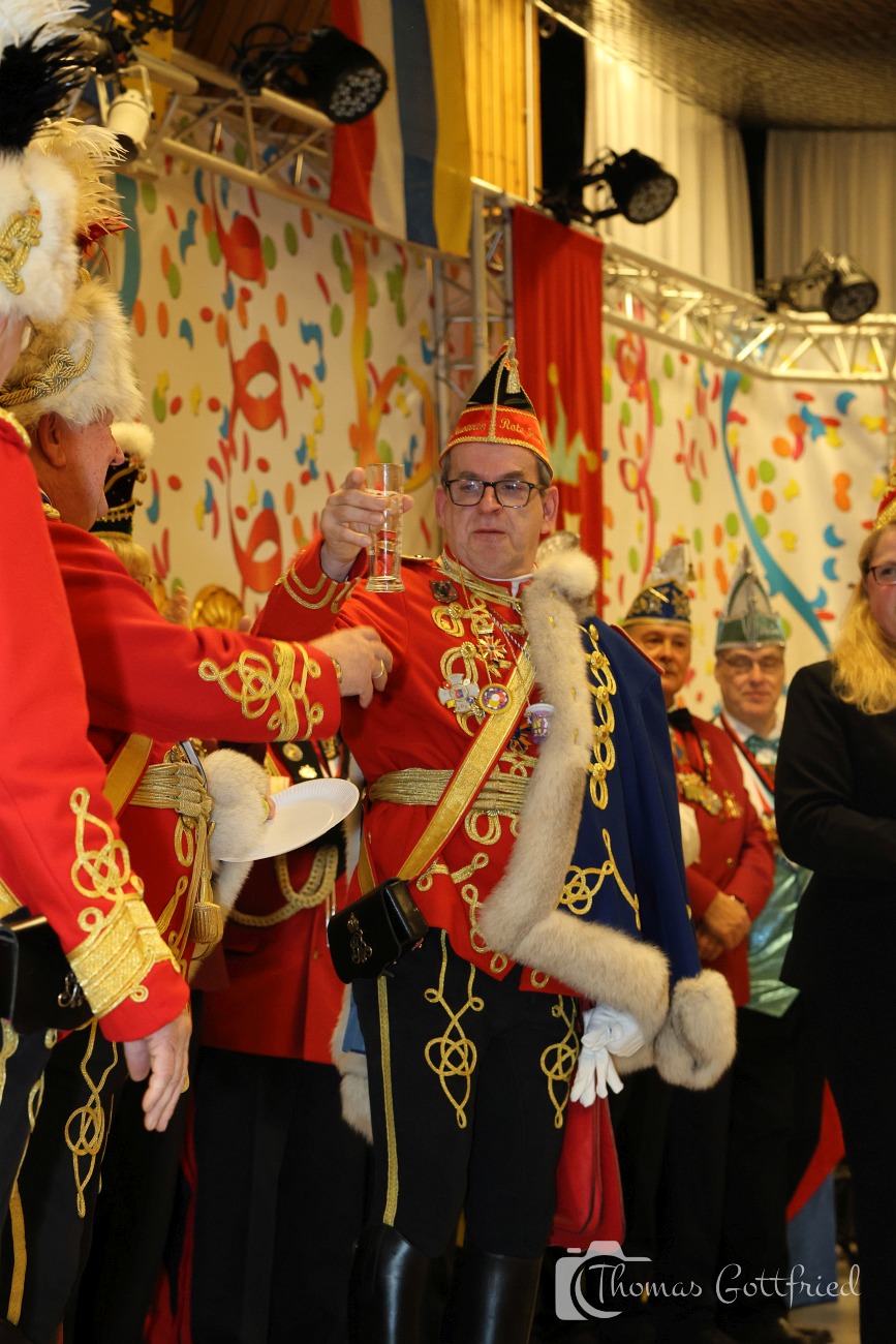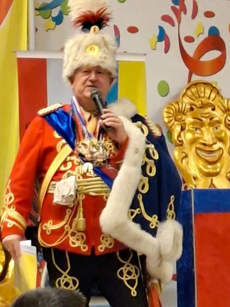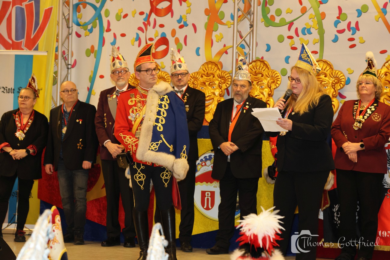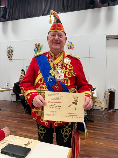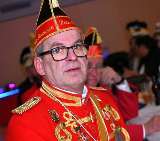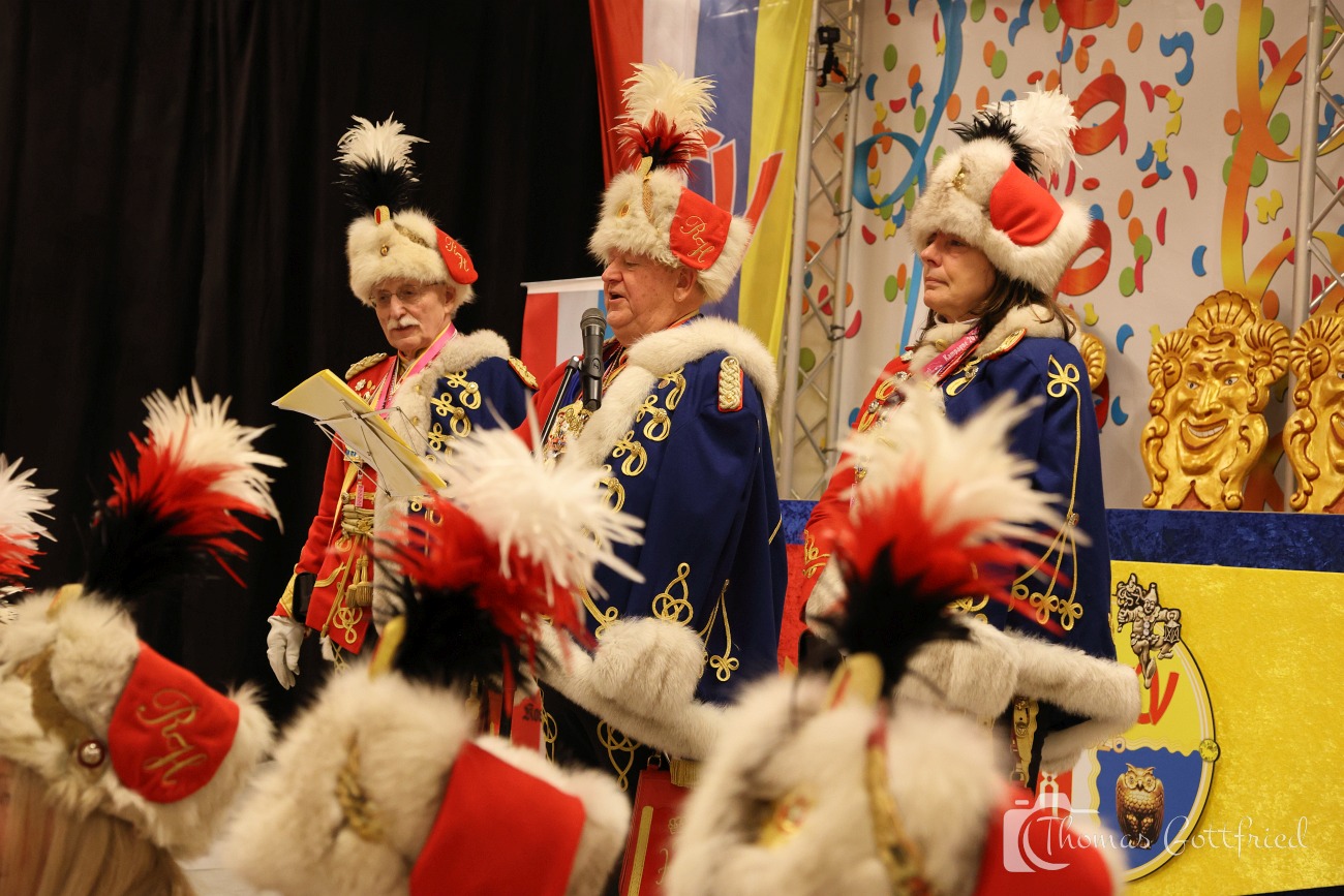 Nun folgten die Ehrungen besonders verdienter Aktiver der Roten Husaren. Der Stadtmarschall der Garde der Prinzessin Heinz Tonser verlieh im Auftrag des Mainzer Oberbürgermeisters den Stadt Orden der Aurea Moguntia an Peter Gerhard.