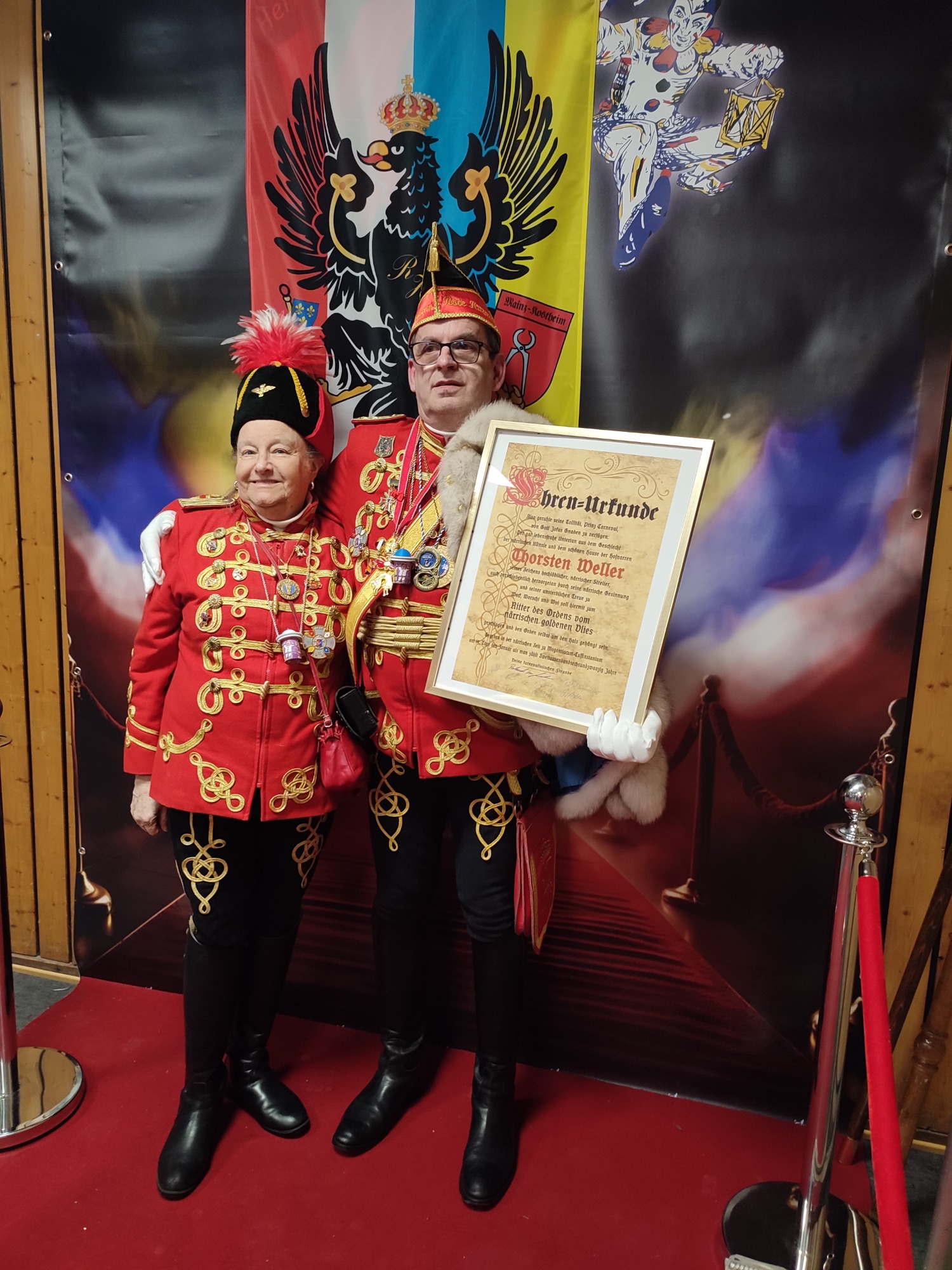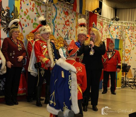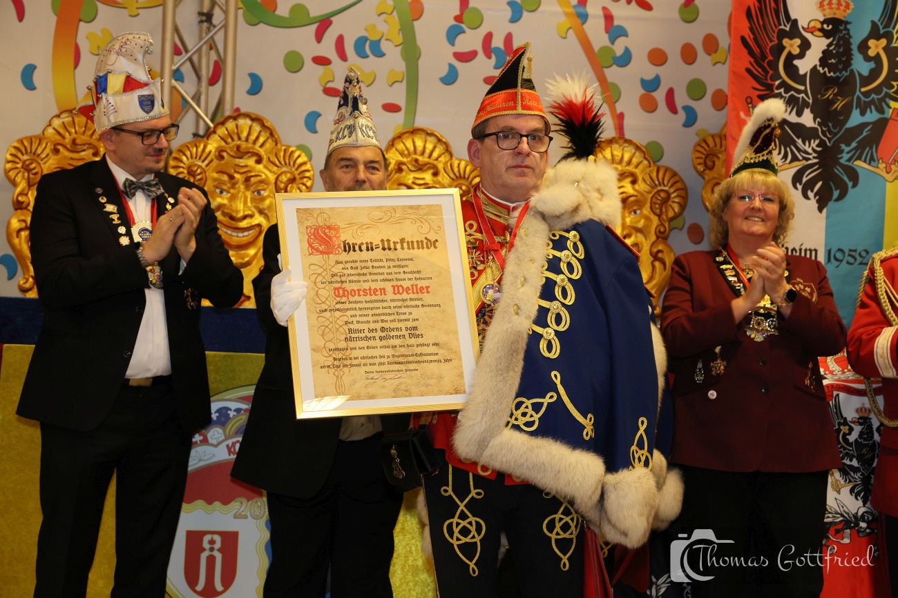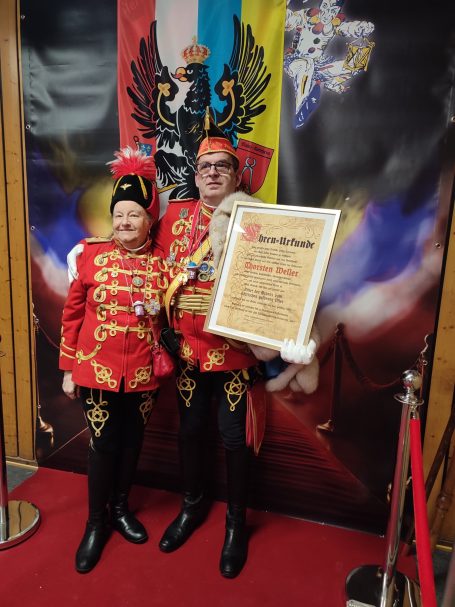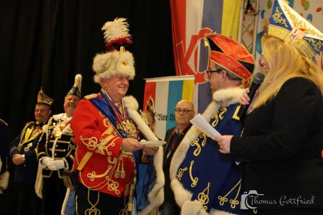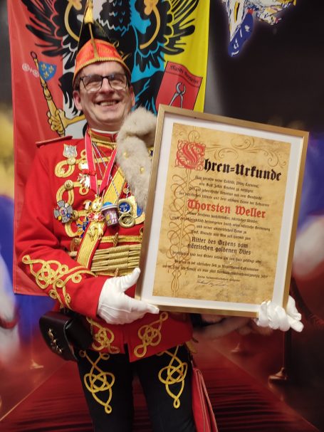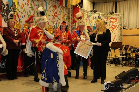 Ihm folgte die neue Bezirksvorsitzende für Wiesbaden/Rheingau der Interessen Gemeinschaft Mittelrheinischer Karneval (IGMK) Jessica Möcks und überraschte Thorsten Weller mit der Ernennung zum Ritter des goldenen Vlies.